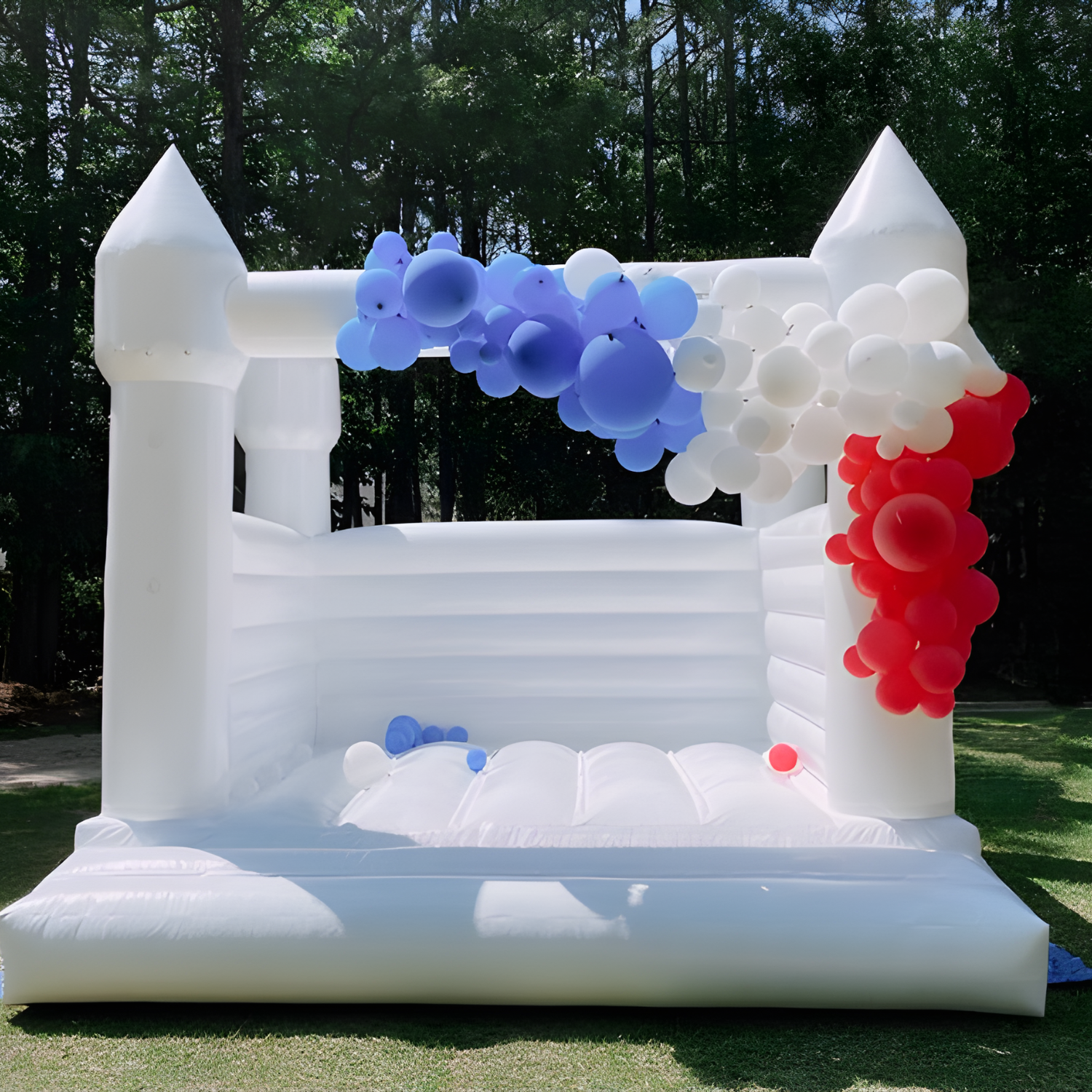 The White Wedding Castle is a stunning inflatable designed for elegant celebrations. Its pure white color complements weddings, bridal showers, and upscale events. Perfect for photo ops and family fun, this castle adds a playful yet classy touch to your special day. No shoes, silly string, food, glitter or drinks etc... THERE IS A $200 REFUNDABLE SECURITY DEPOSIT CHARGED AT CHECKOUT. The bouncer must be blown up & clean when picked up or your security deposit will be voided IF you are using this unit where there is no electricity you will need a Generator for power ! No shoes, silly string, food, glitter or drinks etc... IF THERE ARE ANY OBSTRUCTIONS WITH DELIVERY PLEASE LET US KNOW A FEW DAYS BEFORE YOUR EVENT SO THAT WE CAN PREPARE AND HAVE A SMOOTH DELIVERY |