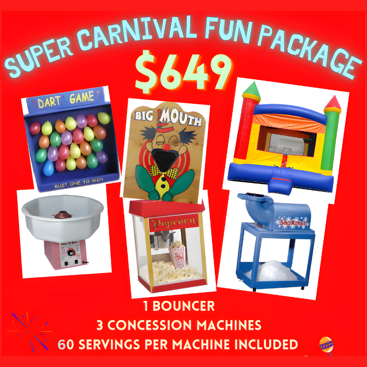 INCLUDES: 1 BOUNCER ( 13 X 13 ) 3 CONCESSION MACHINES 2 CARNIVAL GAMES ALL CONCESSIONS MACHINES COMES WITH 60 COMPLEMENTARY SERVINGS EACH ADDITIONAL SERVINGS CAN BE ADDED Our Super Carnival Fun Package brings the fair to you! Includes multiple carnival games, bounce house, and concession machines. Designed for large events and all-day entertainment If you are using this unit where there is no electricity you will need a Generator to power it up! ( See Generators) |