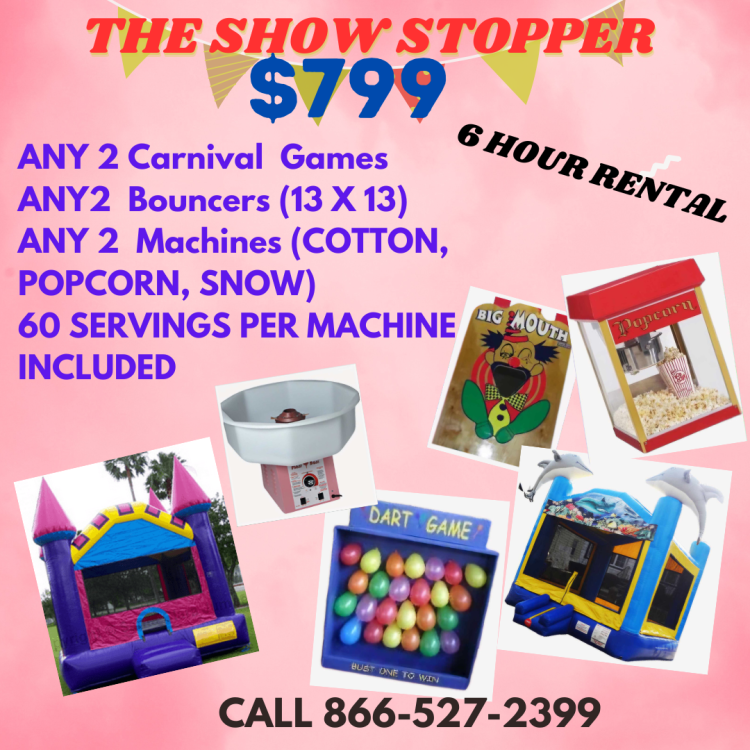 INCLUDES: 2 BOUNCERS (13 X 13 OR SMALLER) 2 CARNIVAL GAMES 2 CONCESSION MACHINES ALL CONCESSIONS MACHINES COMES WITH 60 SERVINGS PER MACHINE ADDITIONAL SERVINGS CAN BE ADDED Make a statement with The Show Stopper package — featuring a bounce house, two concession machines, and your choice of carnival games. Ideal for school fairs, large parties, or community events. If you are using this unit where there is no electricity you will need a Generator to power it up! ( See Generators) |